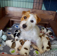This is Dotty and Barry's final litter and what a stunning litter they've had. Dotty is once again a fantastic mother and all puppies are doing well. We have five tan and white puppies and two tri-colour puppies and all are broken or rough coated.